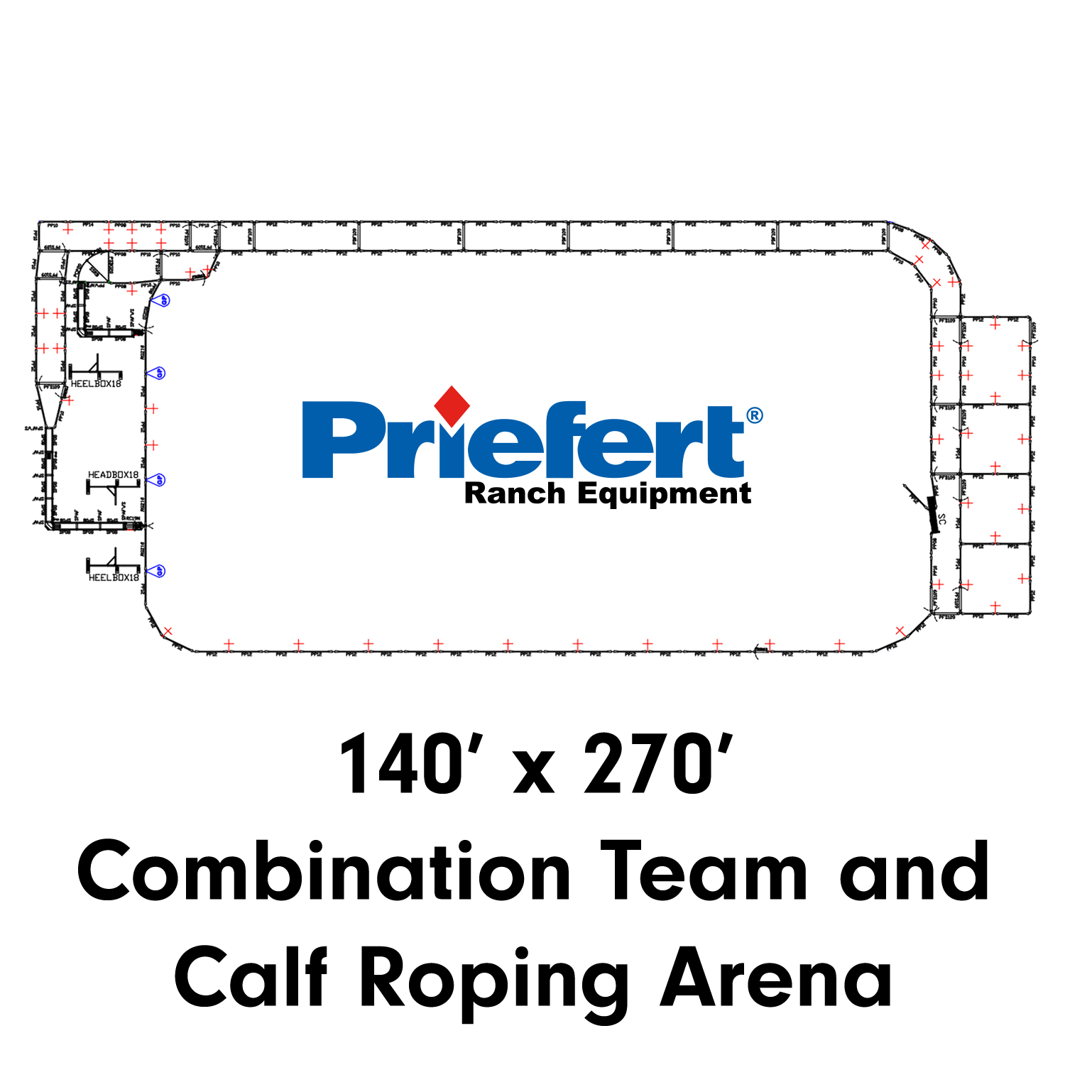 While the idea of having your own roping arena is appealing, the thought of designing and building an arena is often a daunting one. Not to worry, this is where the experts at Priefert Ranch Equipment can help. Priefert is proud to offer a number of pre-designed arena kits. Priefert’s Roping Arenas provide a safe and attractive area for riding and practicing. This combination roping arena is ideal for the multi-event cowboy or cowgirl. It features both a team roping and a calf roping setup in a 140’ x 270’ arena.