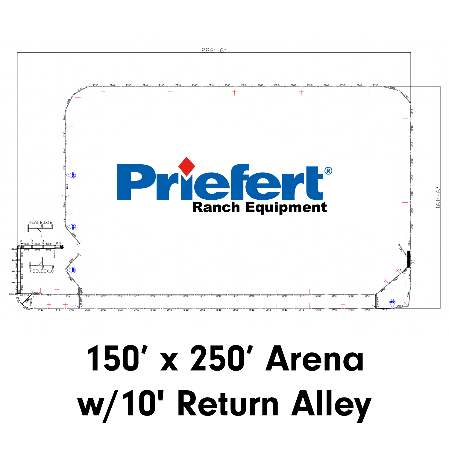 While the idea of having your own roping arena is appealing, the thought of designing and building an arena is often a daunting one. Not to worry, this is where the experts at Priefert Ranch Equipment can help. Priefert is proud to offer a number of pre-designed arena kits. Priefert’s Roping Arenas provide a safe and attractive area for riding and practicing. Our most popular arena size, this arena layout is 150’ wide by 250’ long and includes everything ropers need to create a great practice pen.