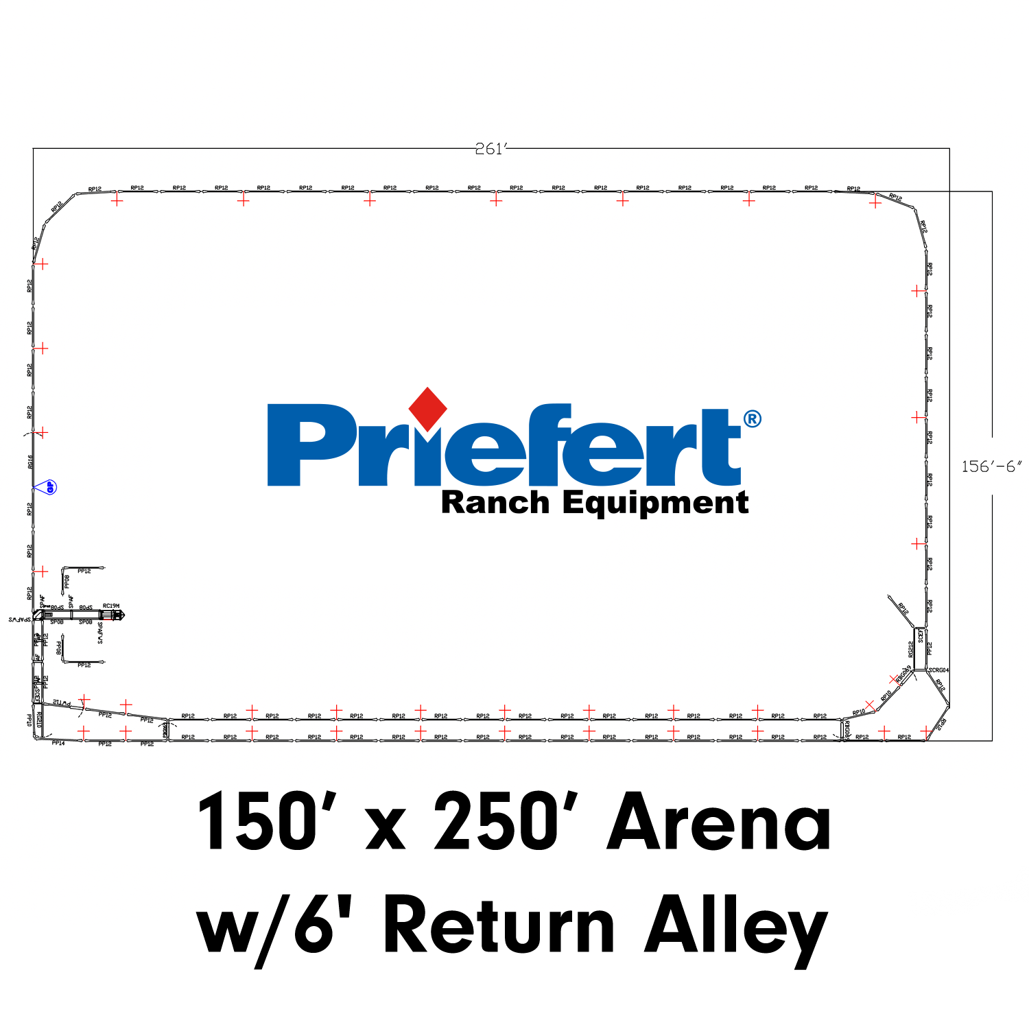 This 150' x 250' arena design includes the RC98M, a 6' wide return alley with holding pens, and is available in your choice of Economy Panels or Utility Panels.
