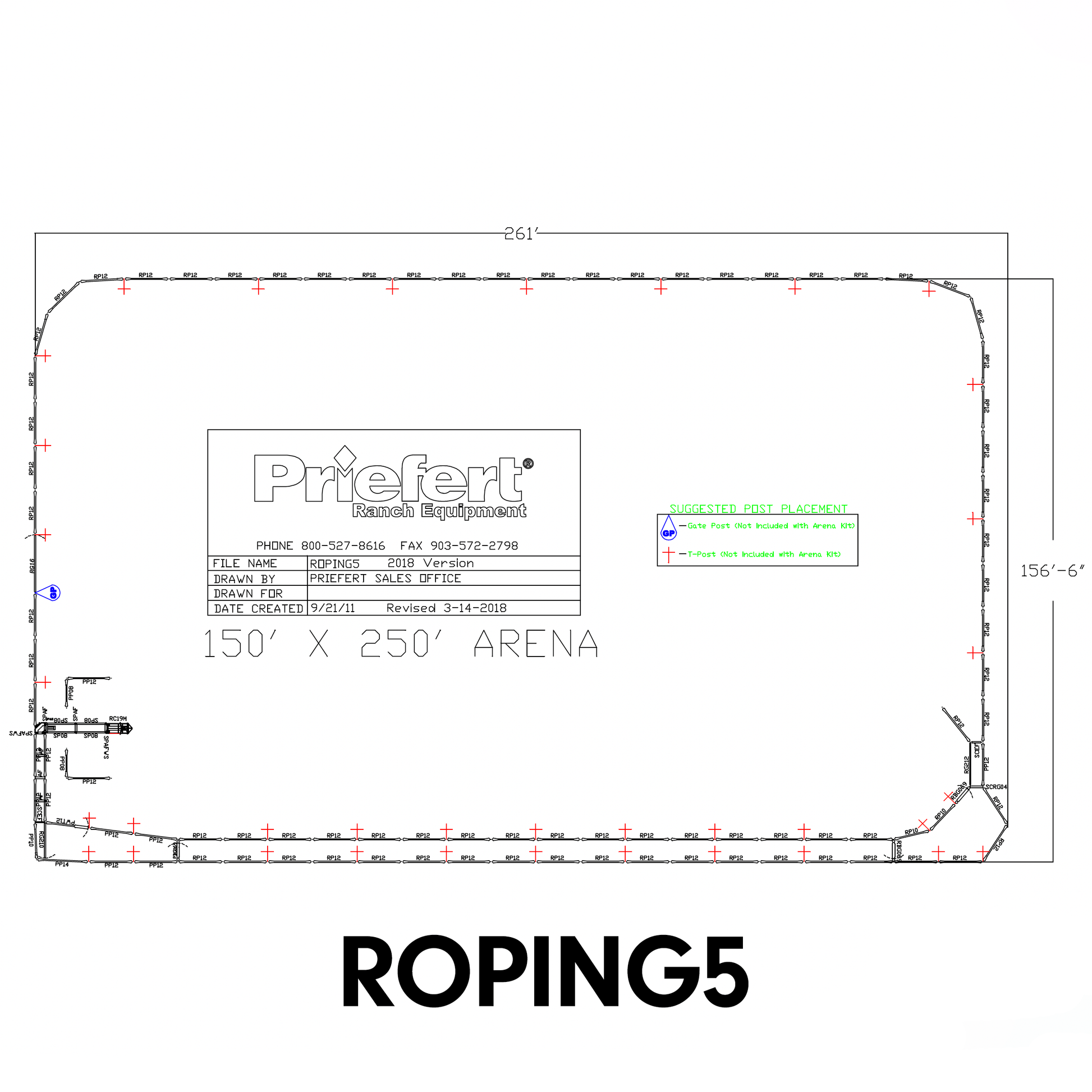 - Our most popular arena size, this basic Roping Arena layout is 150’ wide by 250’ long and includes a roping chute setup, stripping area, and a 6’ wide return alley.