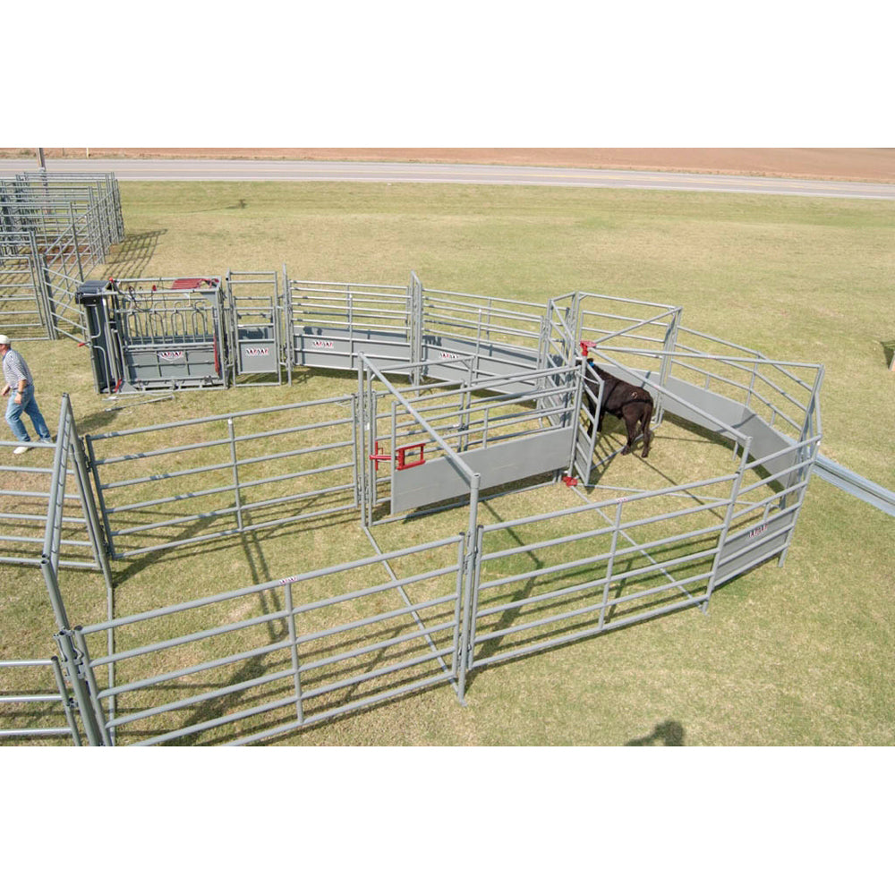 WW Sweep Tubs are 6′ high with 6 horizontal perimeter rails. Sweep Gate features a spring-loaded latch which allows easy forward motion but prevents gate from coming back, avoiding possible injury to operator. Optional “V” Trap includes a 60″ Gate-In-Frame which allows easy sorting or loadout of animals.