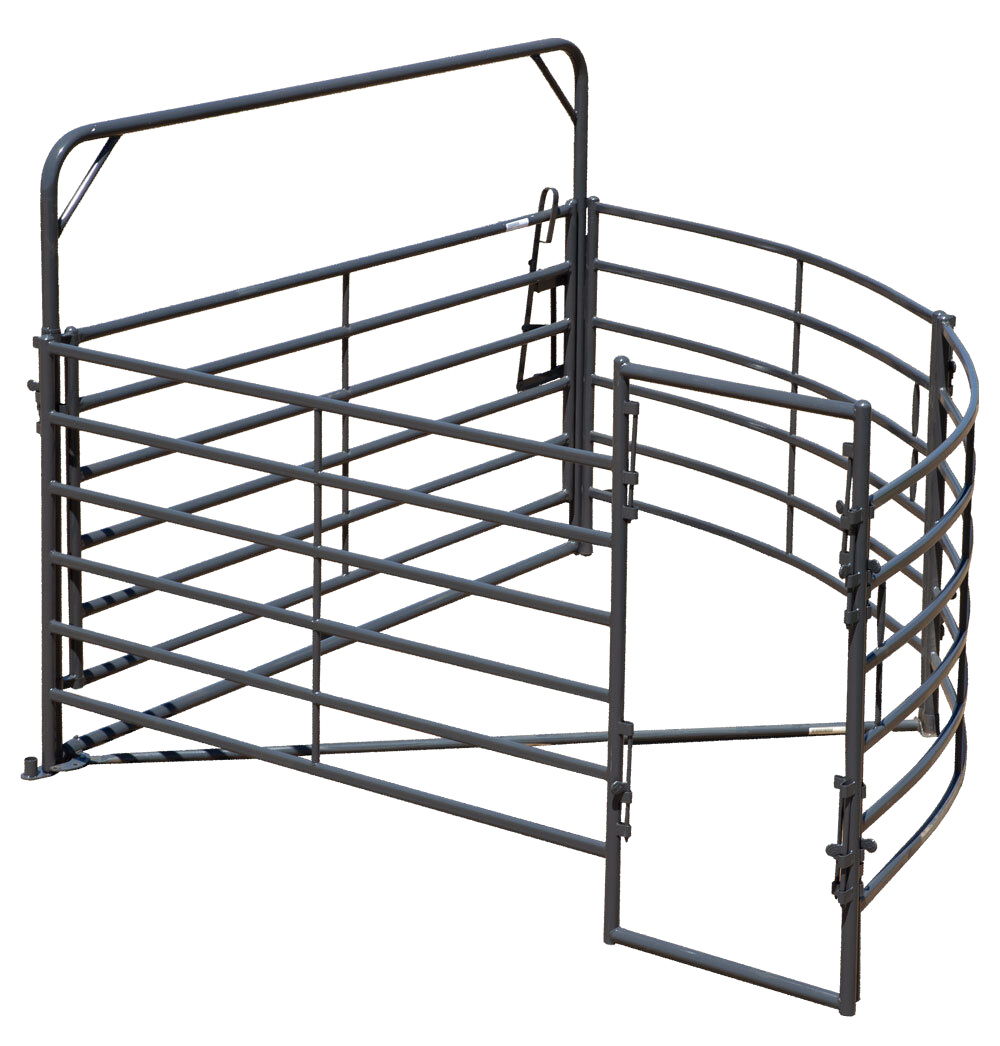 - The 10’ wide sweep gate pushes cattle into the working alley. This gate features a 7’ tall bow frame for added stability and a Double Piston Lever Latch.