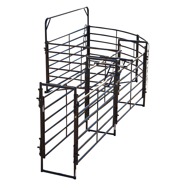 - The 10’ wide sweep gate pushes cattle into the working alley. This gate features a 7’ tall bow frame for added stability and a Double Piston Lever Latch.
