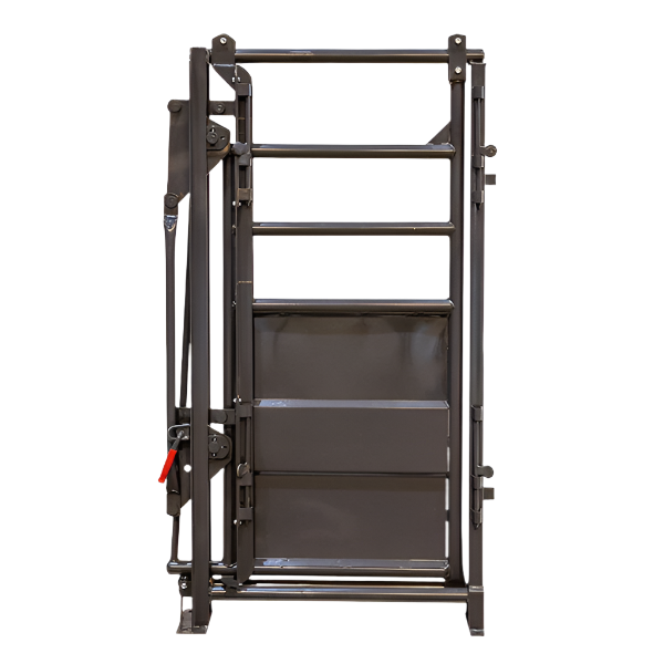 For use between any section of alley panels in an adjustable alley, this heavy-duty roll gate can be used to block cattle and provide alley support.
