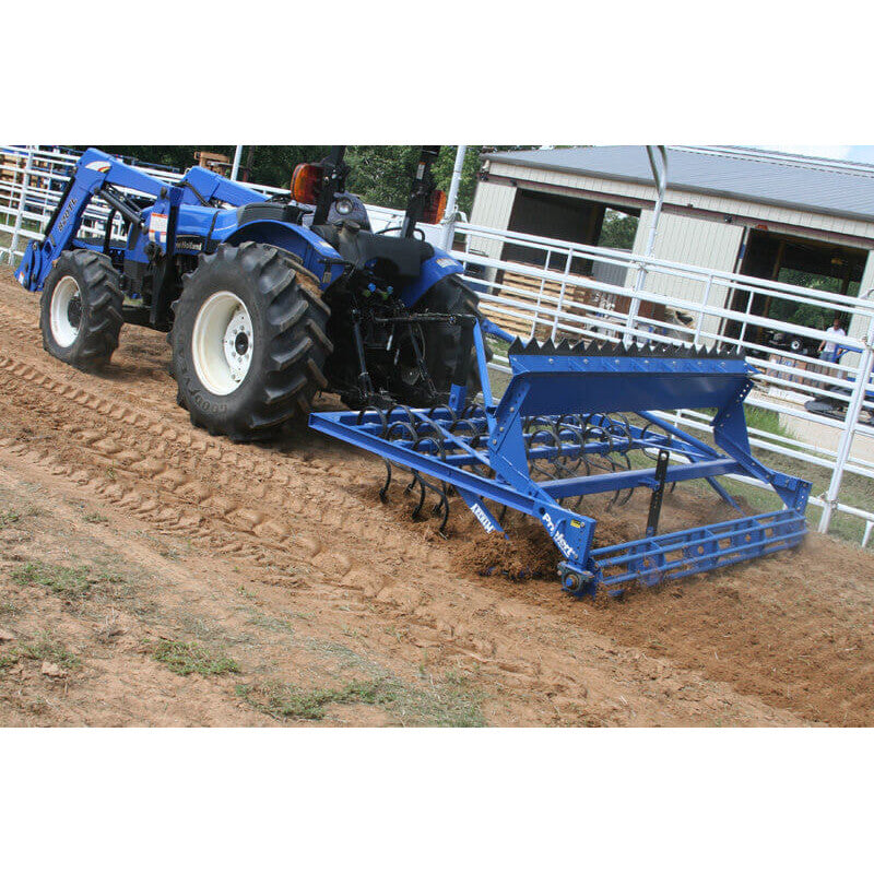 Priefert’s ArenaMaster™ eliminates expensive hydraulics and allows operators to break packed ground, pulverize clumps of dirt, and leave consistent footing; often in a single pass. Offset rows of S-tines provide multiple points for ground breaking efficiency and to minimize large clods. Penetration depth can be regulated by changing the tractor’s top link, lift control height, and/or the ArenaMaster’s™ leveling bar adjustment. The leveling bar also aids in the breaking clods, leveling high spots, and filling in holes. The trailing “Clump Buster” further pulverizes dirt clods and packs the sub-surface for consistent footing; it also fluffs the top layer of dirt to ensure a smooth surface, suitable for any practice or competitive arena.