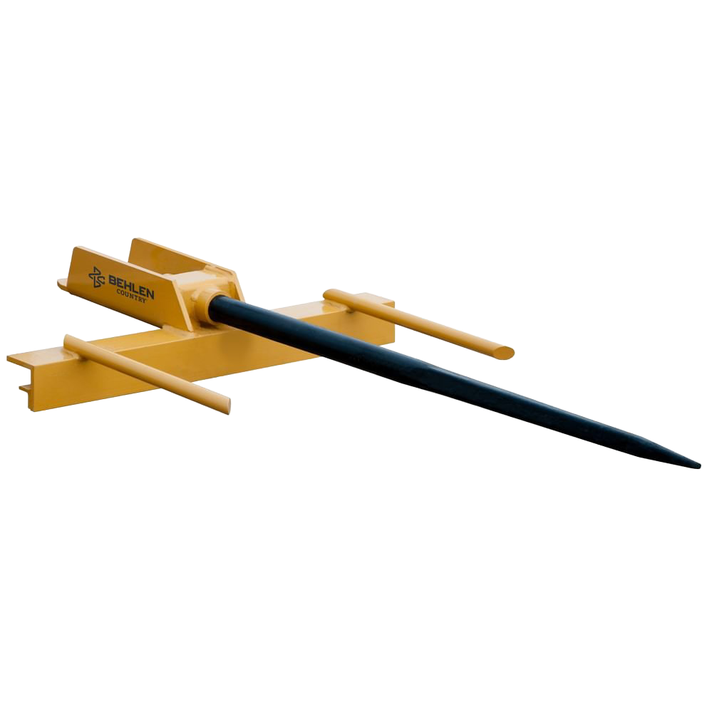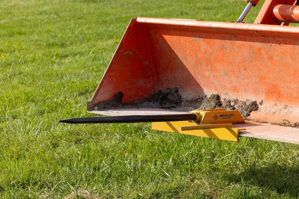 The Bucket Bale Spear mounts to most bucket front-end loaders with a single bolt and lets you easily pierce, lift, and move round bales of hay.