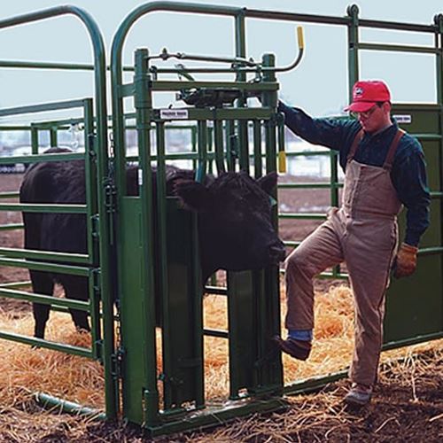 Self-Catching Head Gate with Safety Release Mechanism has two emergency trip releases that quickly relieve pressure on an animal's neck if needed. This unit also works well for those who prefer to calve with the animal on its side.