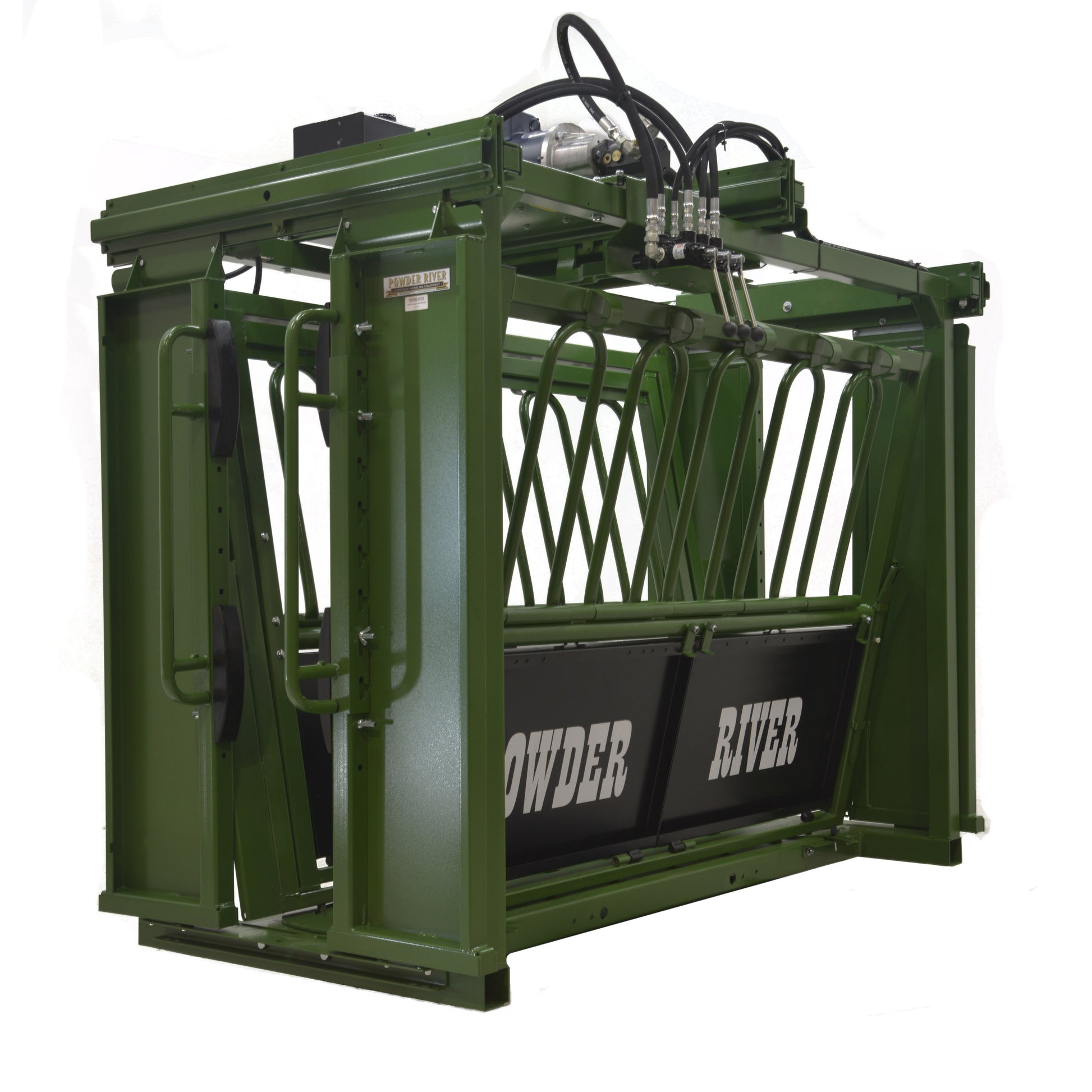 This standard model of the 2500 series cattle squeeze chute includes a hydraulically actuated headgate, center squeeze, and tailgate. All of these components utilize the enhancement of a rack and pinion gear set.