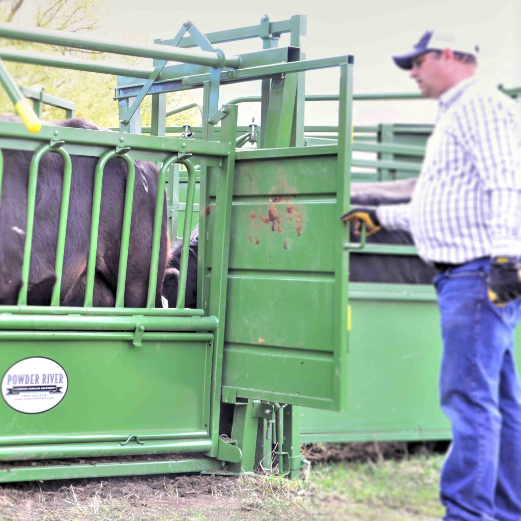 The full-featured M1500 Manual Squeeze chute is has everything you need to manage a smaller herd with easy temperament and the occasional smaller bull. It features time tested headgate, formerly used with our legendary XL Manual Chute) with good leverage and holding power. The double-sided center squeeze holds cattle upright by not knocking animals off-center like other brands. A fully adjustable floor means you can adjust the chute for a wide range of animal sizes. The 1500 Chute series features a roll-door tailgate that is simple and easy to use. Drop fingers along the side of the chute side allow for good access and slam latches make them easy to close. All Powder River Chutes include an important side exit to aid in exiting animals that may be in distress, it also can act as great sorting tool.