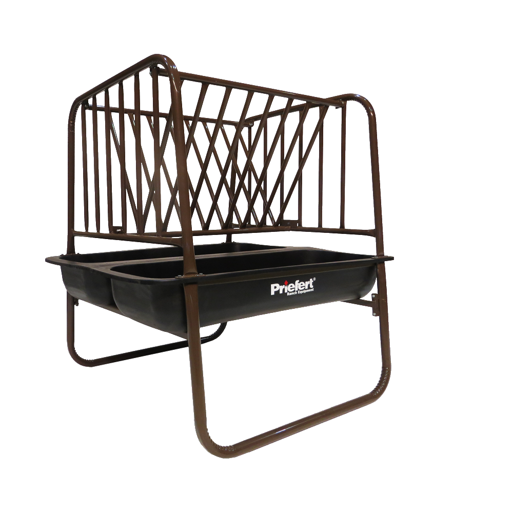 This feeder features a sturdy double tub poly liner and a hay rack. The legs are powder-coated over galvanized tubing for extra durability.