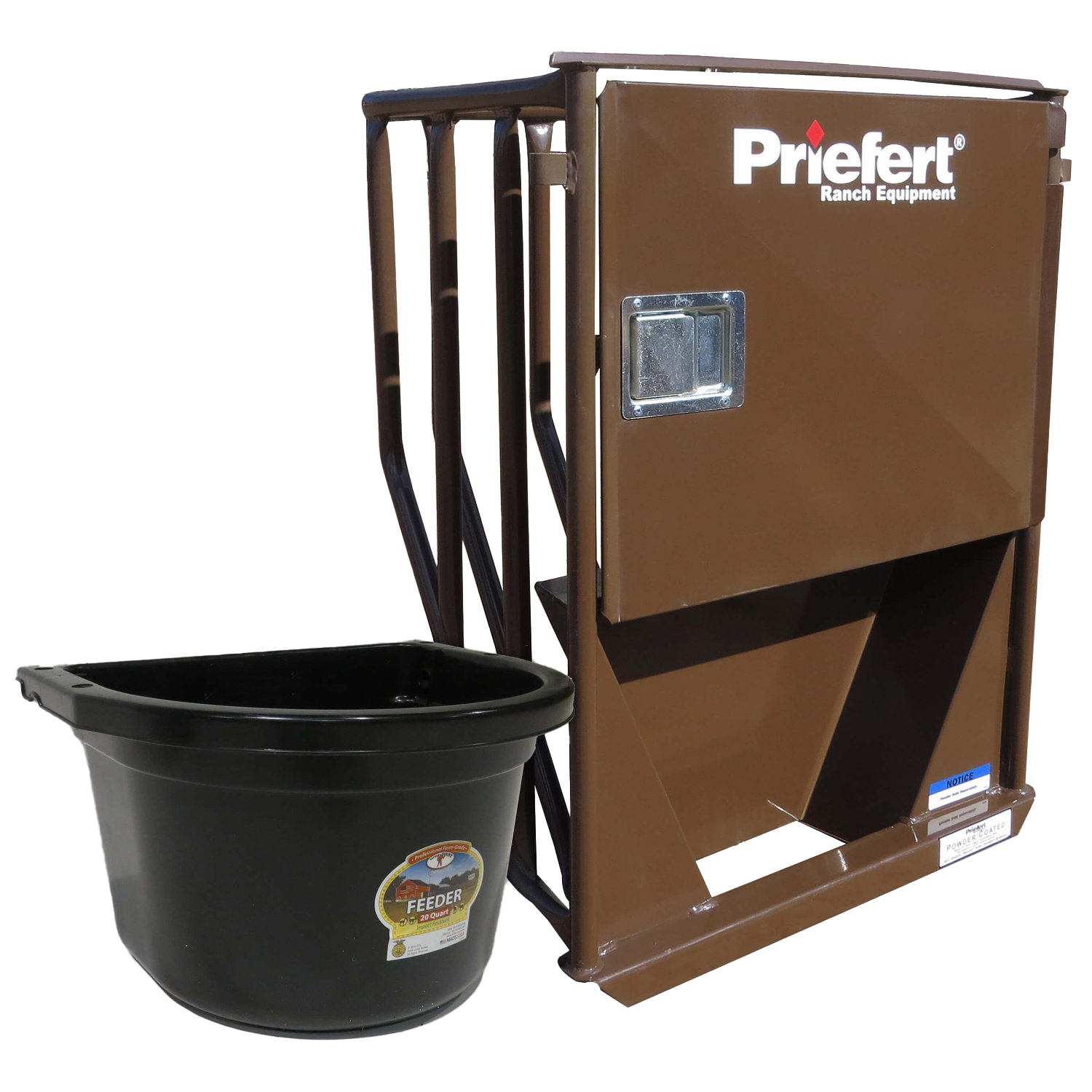 - This durable, steel feeder includes Priefert’s Black Feeder Bucket (FF20BLACK) and mounting bracket to allow users to mount the plastic feed bucket inside the stall front, directly under the feeder’s integrated feed chute. This setup allows users to quickly and easily feed grain or pellets from outside the stall, without having to open a feeder panel.