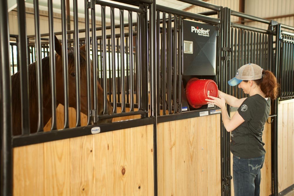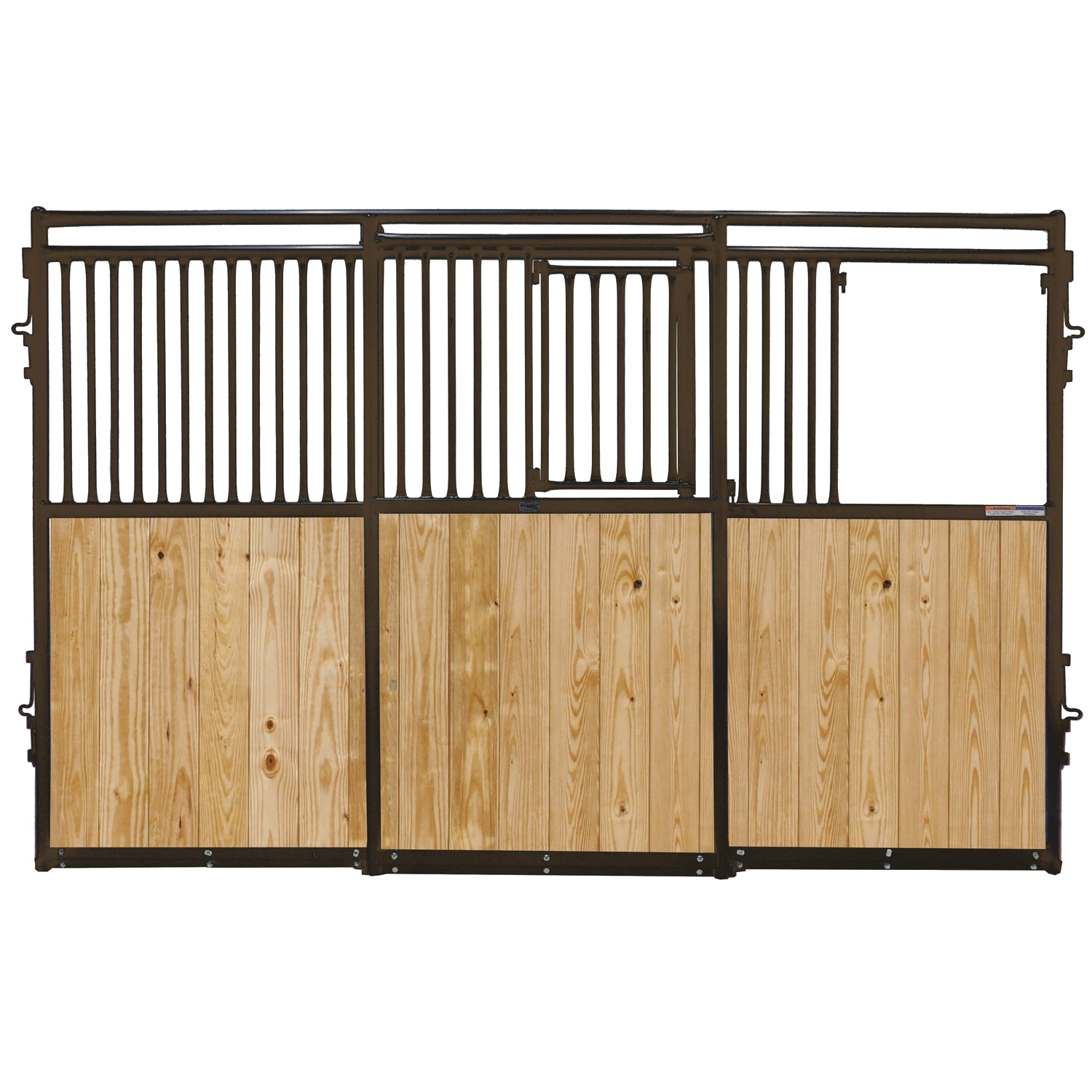 Priefert’s Premier Stalls have been a mainstay in the equine industry for decades. Premier Stalls are safe, attractive, and affordable. This Premier Stall Front combines a vertical bar top with a wood-filled bottom (Wood Kit sold separately). These stalls are designed with the highest degree of consideration for the safety of both the horse and handler. Our Premier Stalls offer horse owners practical solutions for creating a safe, functional environment for their valued animals. This stall front features a center-open door design. The door slides open on apple core rollers. Each stall door includes an access window. The stall front panel also features an opening that allows owners to select a window or feeder option (each sold separately). The door closes using a gravity latch, which can accept a lock if an owner desires. The bottom portion of the stall is constructed from galvanized steel to provide maximum resistance to rust and corrosion. Available in black or brown, these stall fronts feature an attractive powder coat finish to help the stall resist rust, scratches, and fading, adding years of life to your investment. No tools are required for assembly. Our stall fronts and panels join using simple pin connectors. A starter post is required for stall setup when you are not connecting to a wall or other existing structure (starter post sold separately). Priefert Premier Stall Fronts are available in 10’ and 12’ lengths.