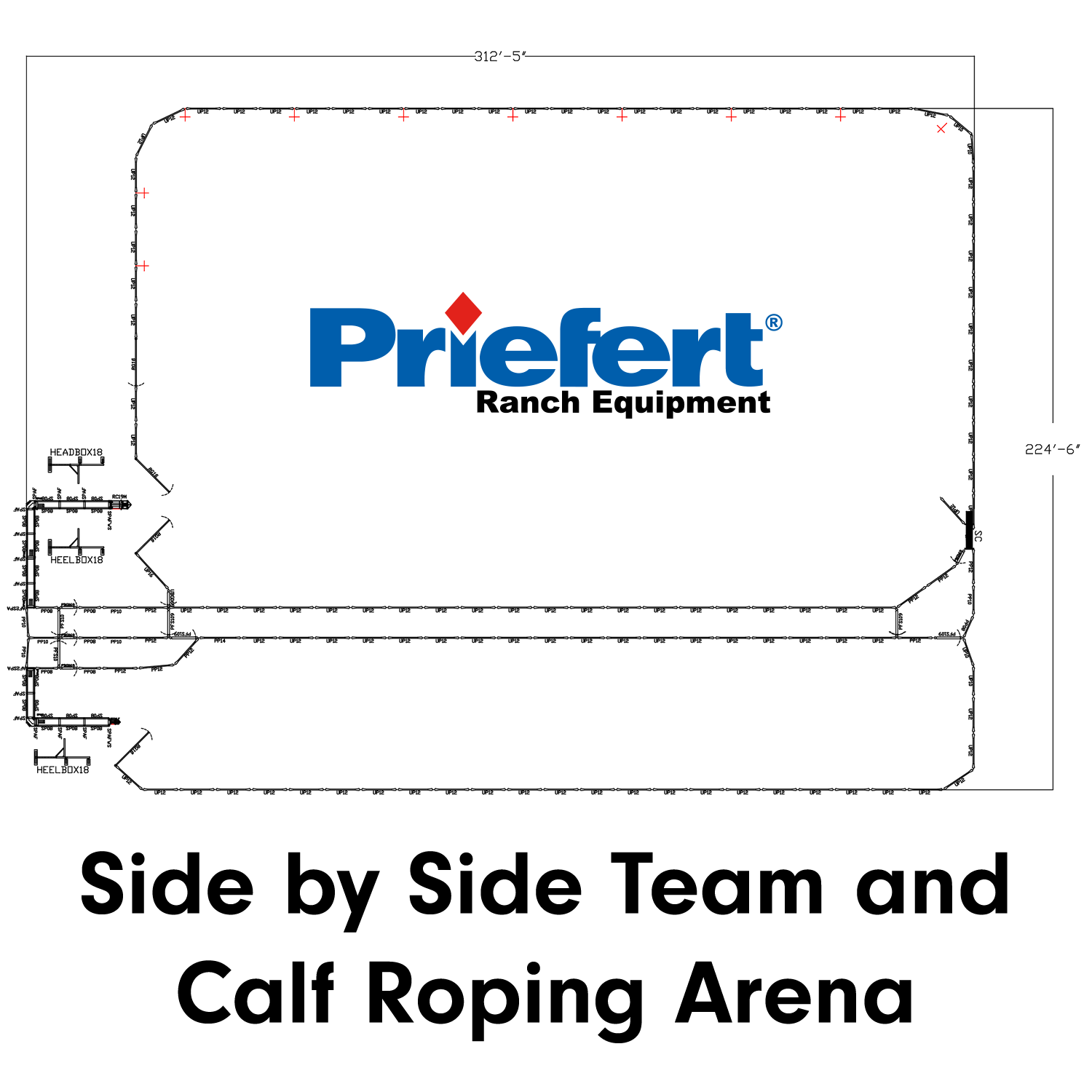 - The calf roping arena features Priefert’s Calf Roping Chute and a single roping box. A gate at the end of the arena connects to the small catch pen and shared return alley.