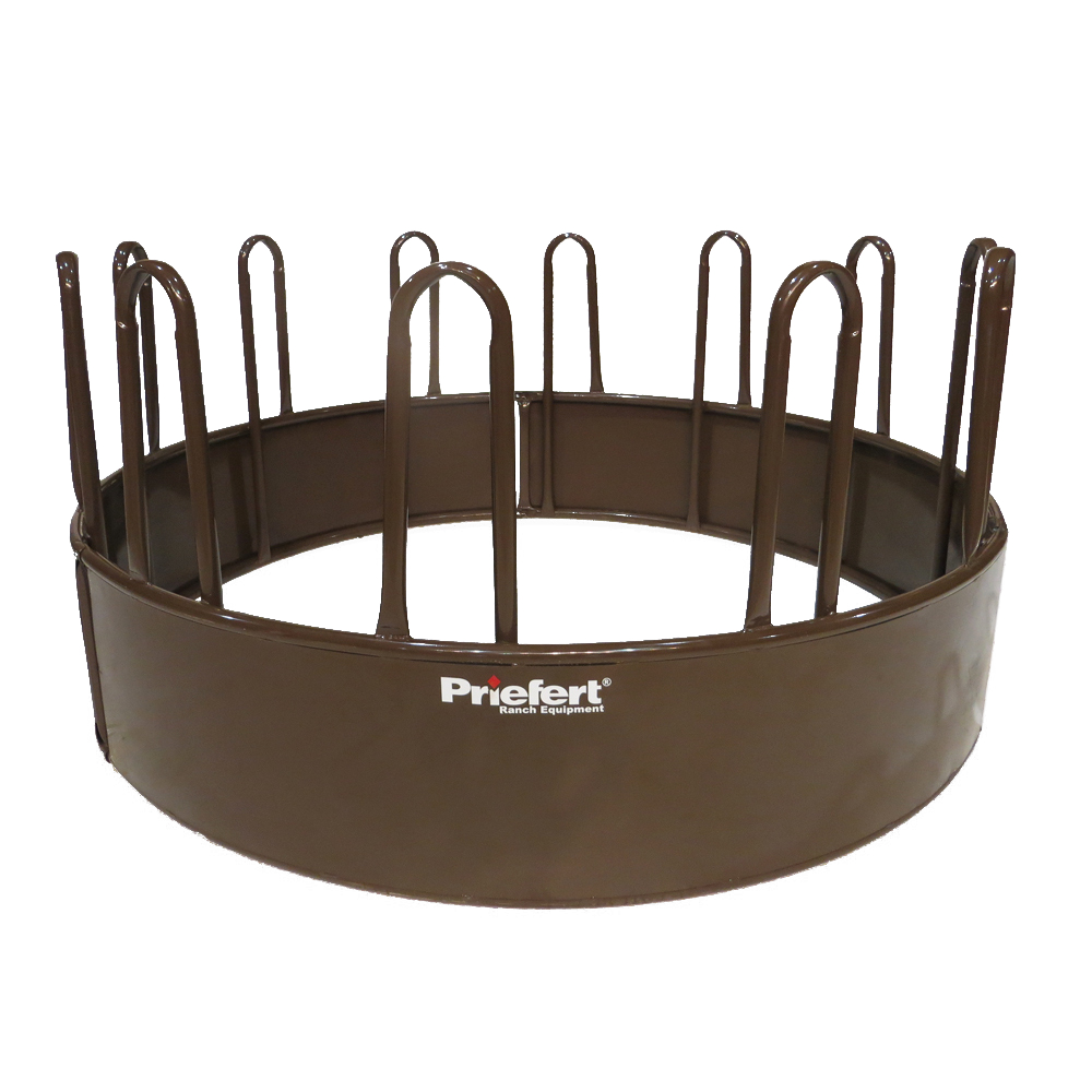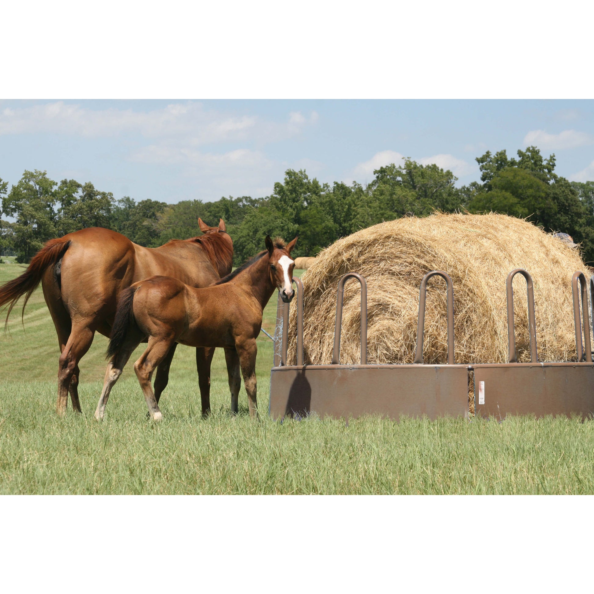 The Tombstone round bale feeder is powder-coated brown. Its 17" sheeted bottom keeps horses from stepping on hay and protects their legs from injury.